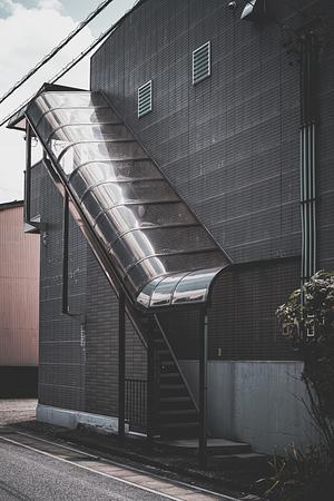 Rigid and reflective, an architectural side-channel, wrapped in its own reflection: exposed yet contained.