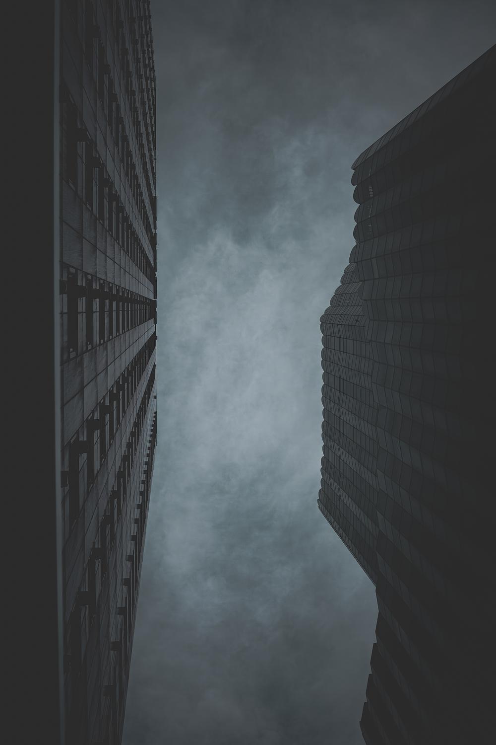 Dark geometry climbs toward sky static: structure reaching, signal fading.